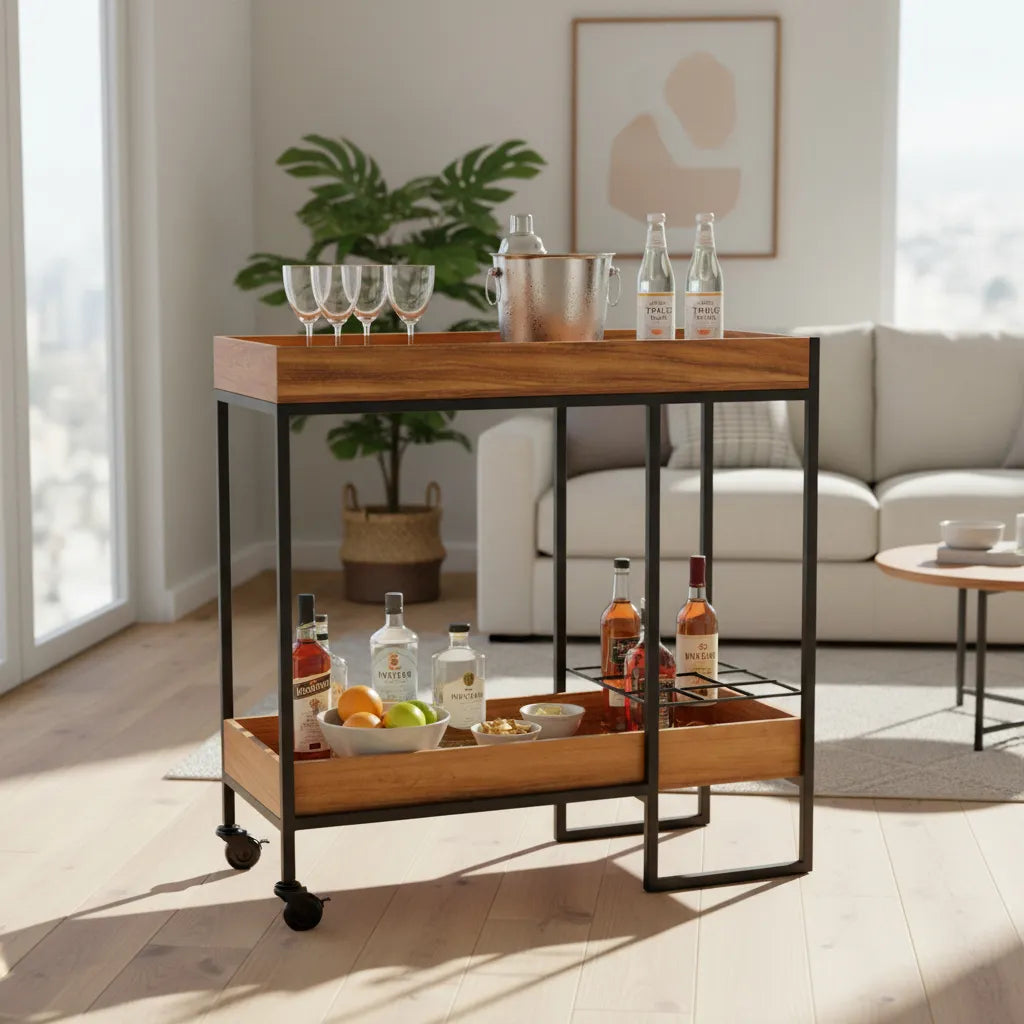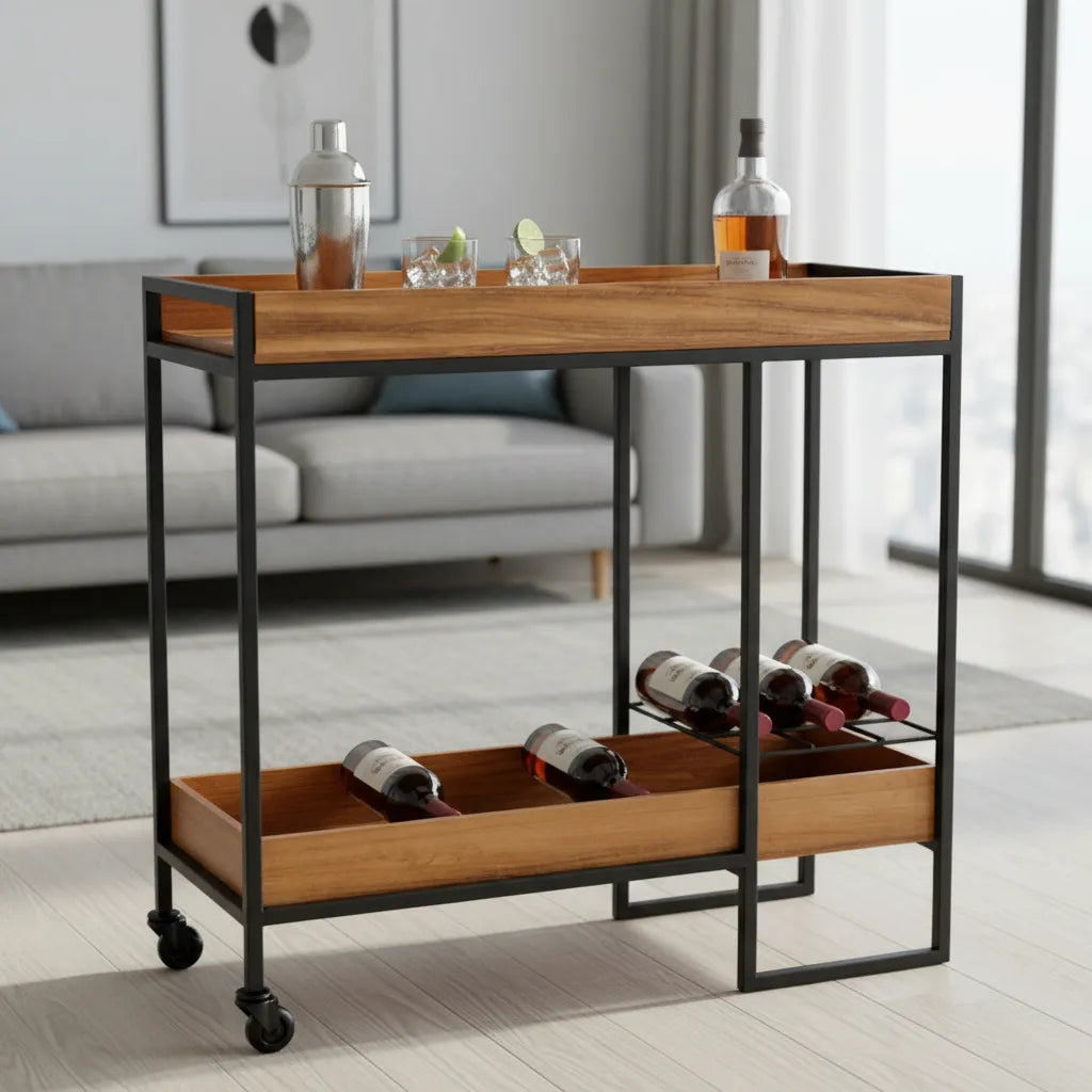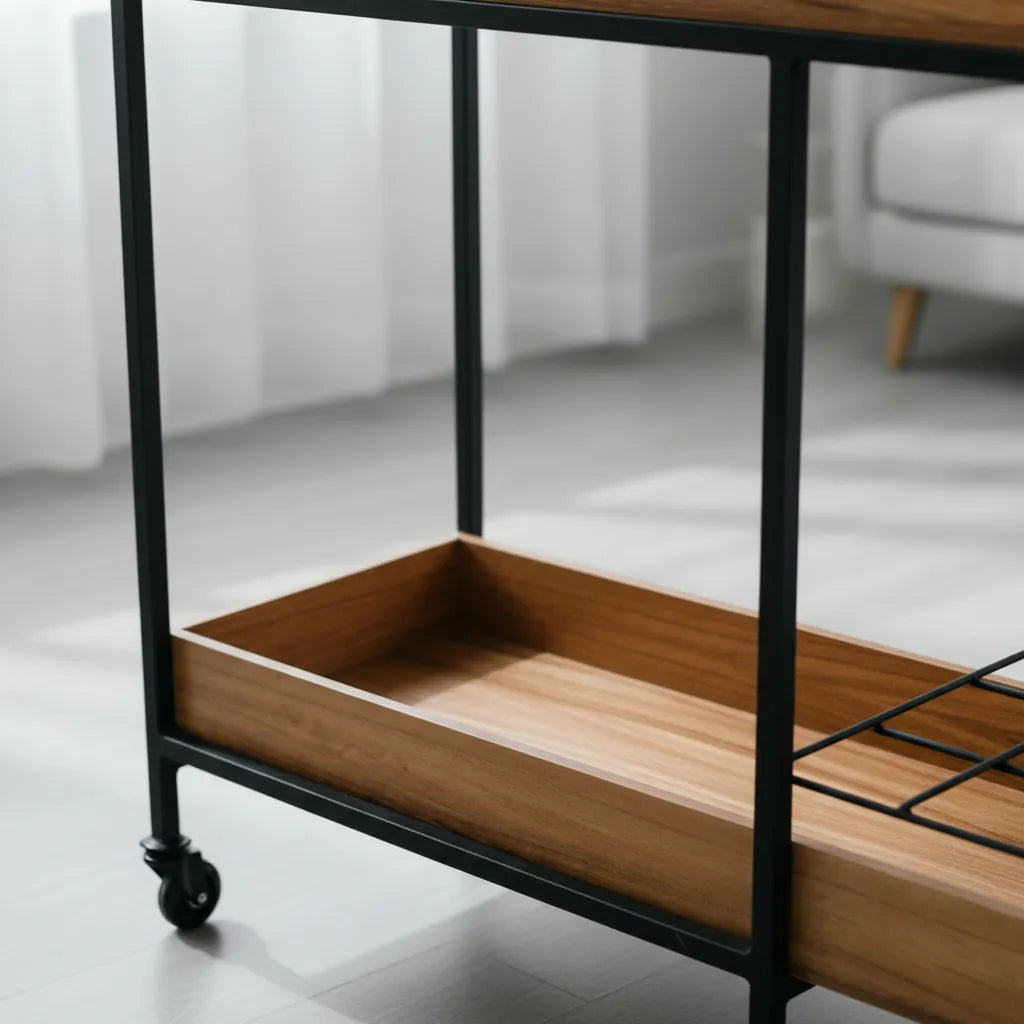 Ideal como barra móvil, mesa auxiliar o elemento decorativo, su estructura ligera y ruedas discretas permiten trasladarlo con facilidad para acompañar tus reuniones, tus espacios y tu día a día con total practicidad.