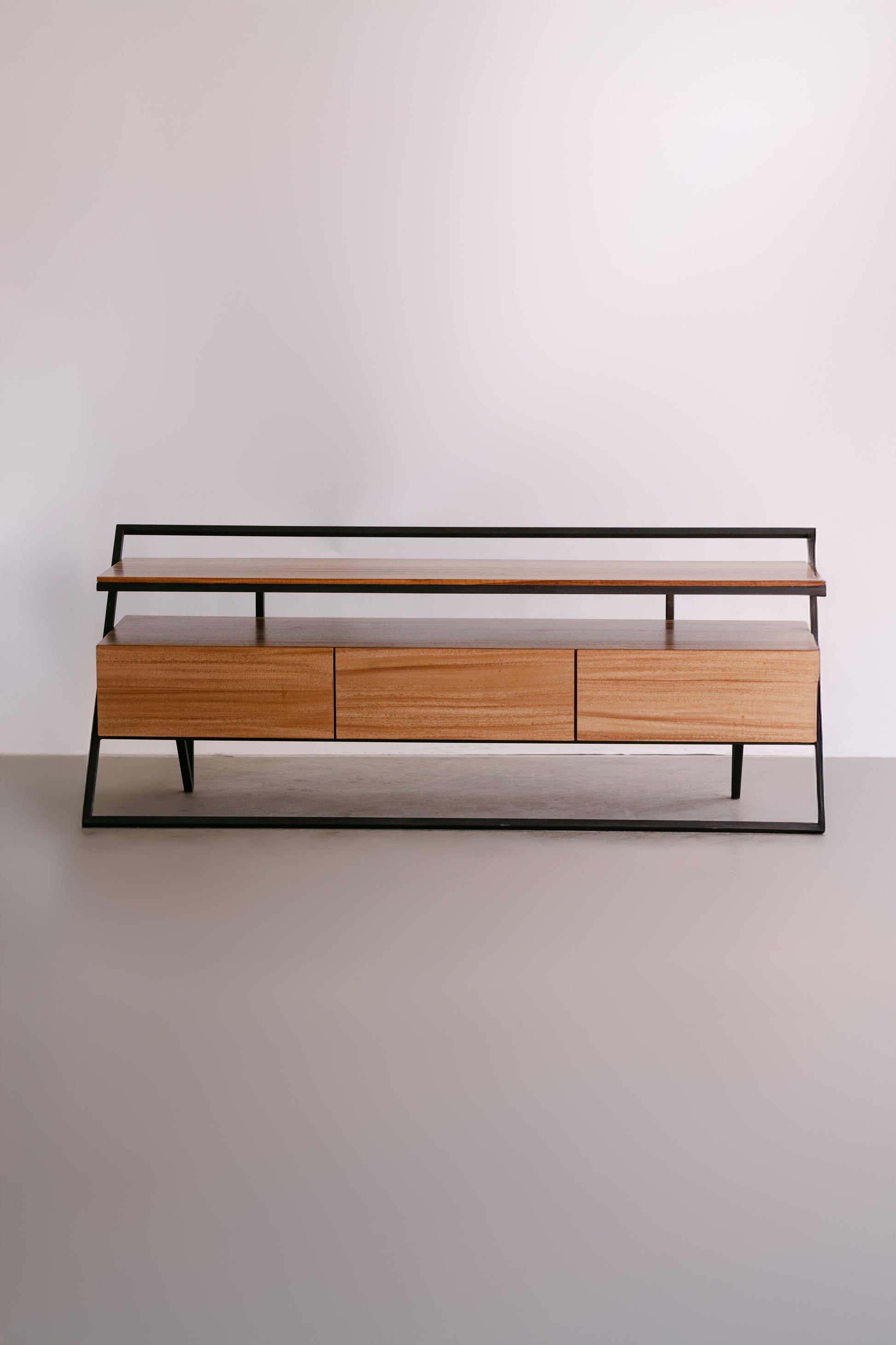El Centro de TV Mónaco en chapa de parota destaca por su presencia sofisticada y diseño contemporáneo. Su estructura de líneas ligeras en metal combina armónicamente con la calidez natural de la madera, creando una pieza que aporta equilibrio, carácter y estilo a cualquier sala.
